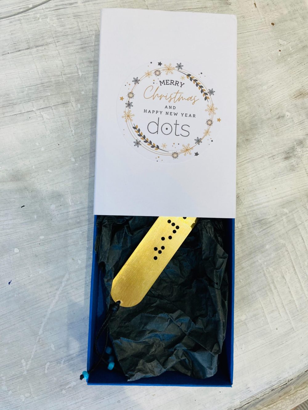Γούρικος σελιδοδείκτης με τη λέξη Αγάπη, Τύχη ή Χαρά στη γραφή Braille, χαραγμένη διάτρητα σε μπρούτζο.