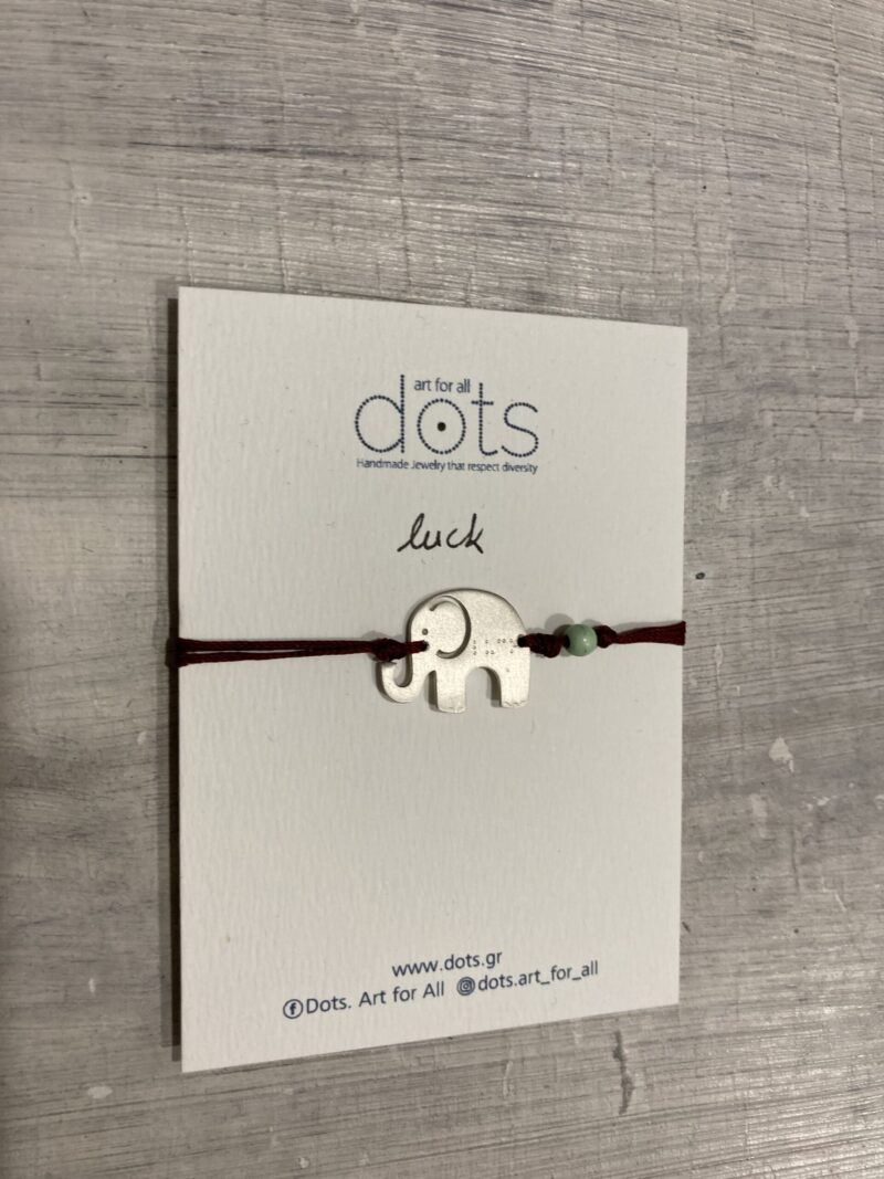 Χειροποίητο βραχιόλι ελεφαντάκι με τη λέξη luck=τύχη χαραγμένη στη γραφή Braille .